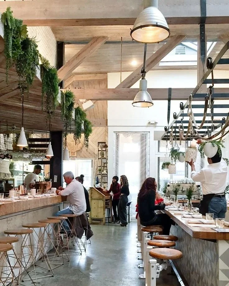 Modern brunch café, evening bistro fire-cooked dishes, and dedicated takeaway sandwich window